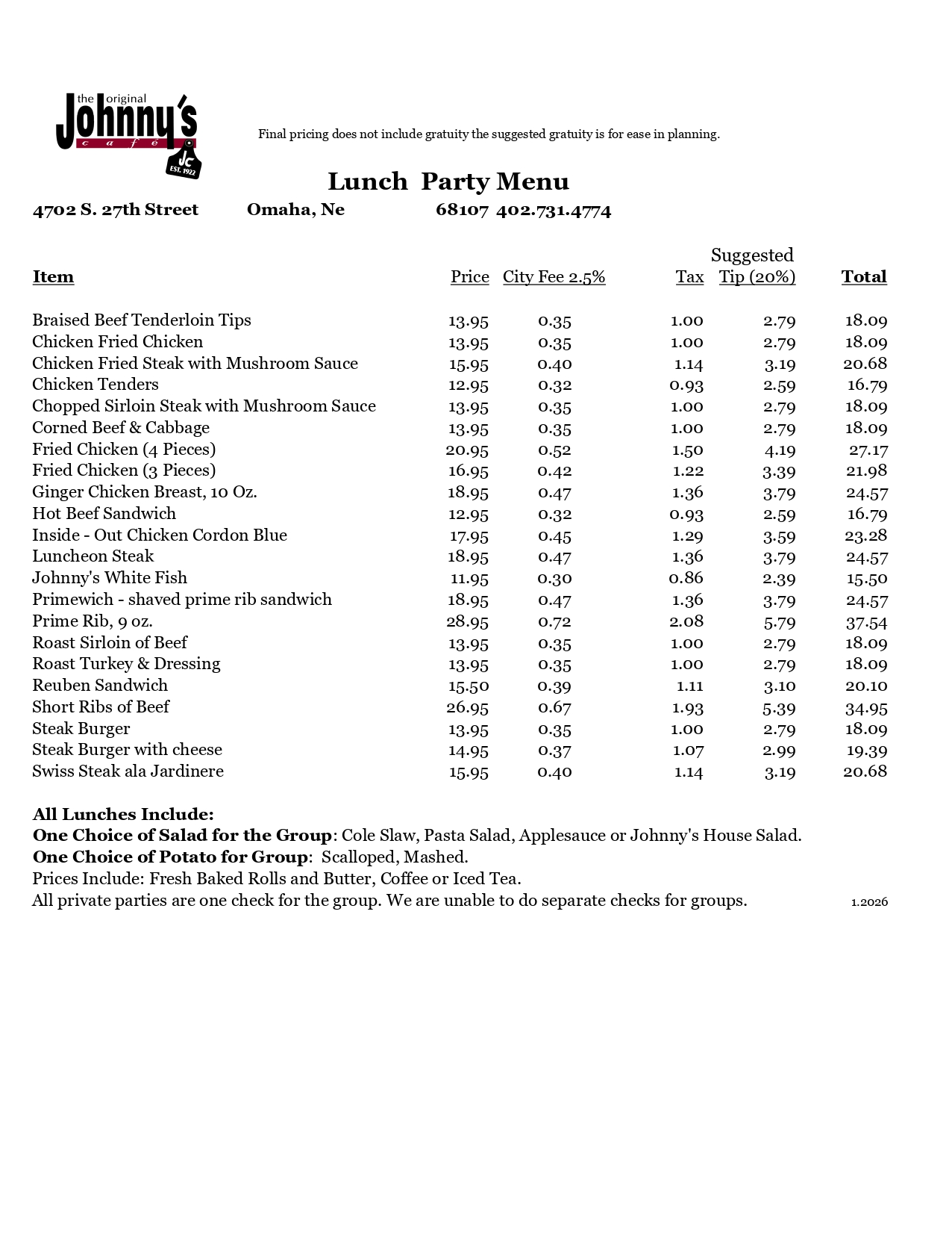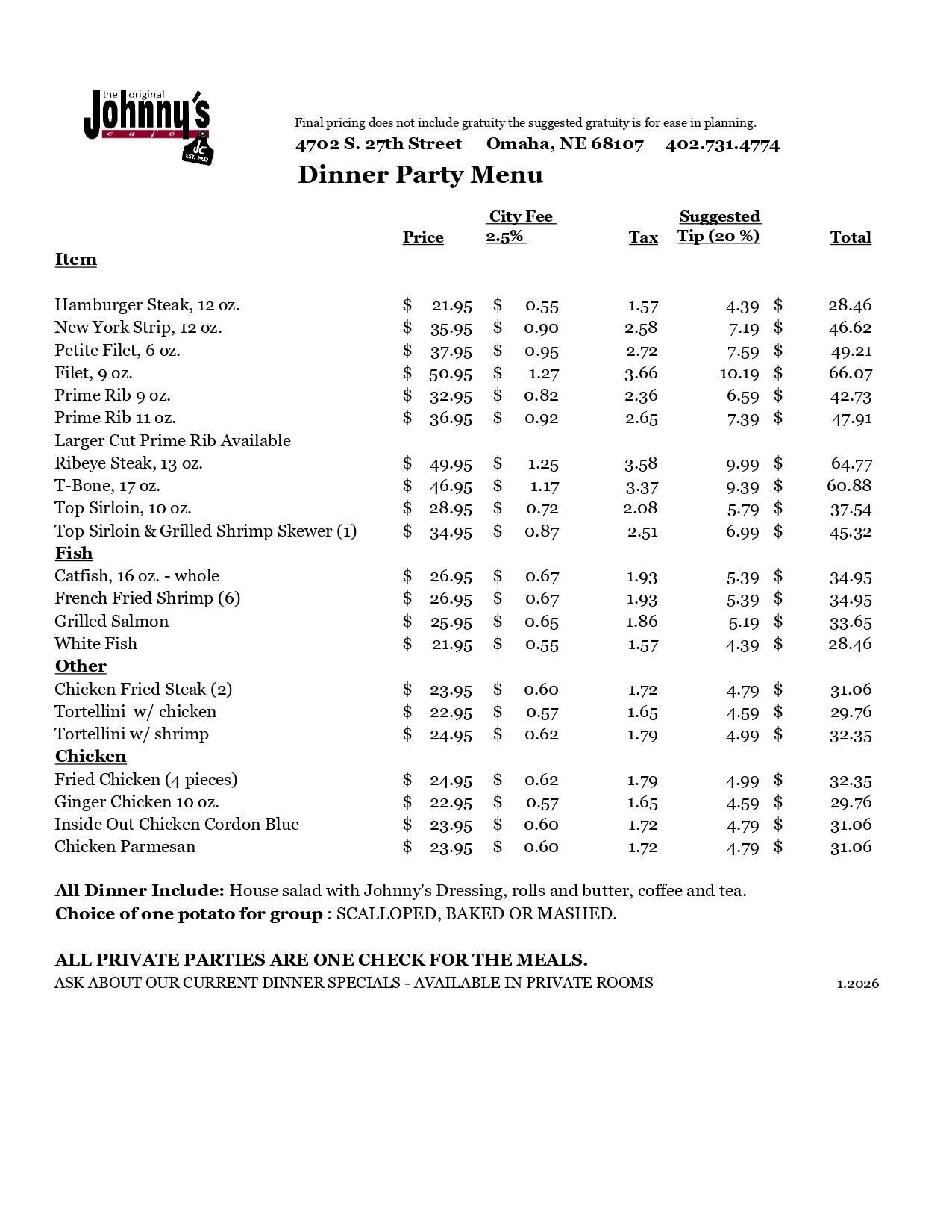 All Dinner Include: House Salad with Johnny's Dressing, Rolls and Butter, Coffee, and Tea. Choice of One Potato for Group: Scalloped, Baked, or Mashed • All Private Parties Are One Check for The Meals • Ask About Our Current Dinner Specials - Available in Private Rooms. Final pricing does not include gratuity (City Fee 2.5% • Suggested Tip (18%) + Tax)